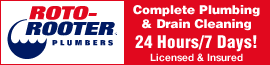 Roto-Rooter![]() (877) 729-7686 www.Rotorooter.com We are one of the largest and fastest growing full service plumbing and drain cleaning companies in the world. When you need a qualified plumber, contact your local Roto-Rooter plumber. There's never an overtime charge. Roto-Rooter Plumbers are clean and professional, and it gets fixed right the first time. There is no extra charge for nights or weekends, and you know the price before any plumbing work is performed.Roto-Rooter Plumbers guarantee workmanship and parts.